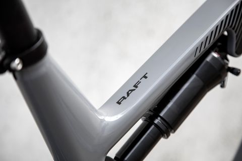 La Raft TR tiene un marco ligero de fibra de carbono que tiene puntos de montaje para 2 portabidones dentro del triángulo delantero del marco. Otros puntos de montaje te permiten llevar herramientas y otros accesorios, como una mochila para el tubo superior de la bicicleta.